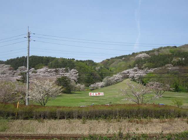 山の斜面には「さくら祭り」という看板と気持ちのよさそうな芝生の斜面。